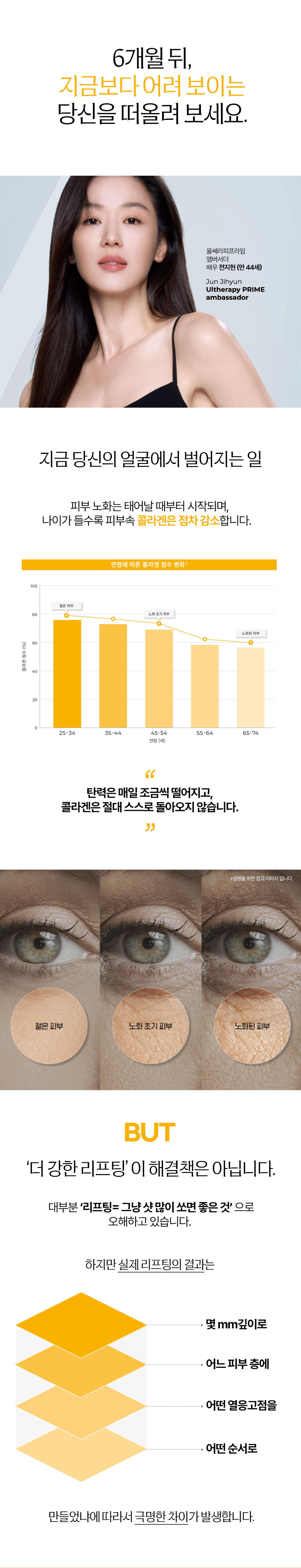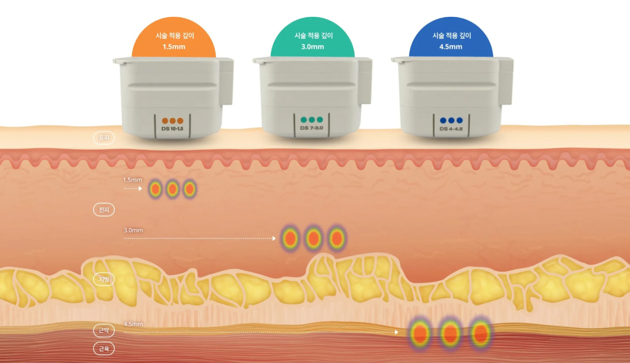 피부 속 진피층과 SMAS층을 타겟으로 65~70°C의 열 에너지를 조사하여
